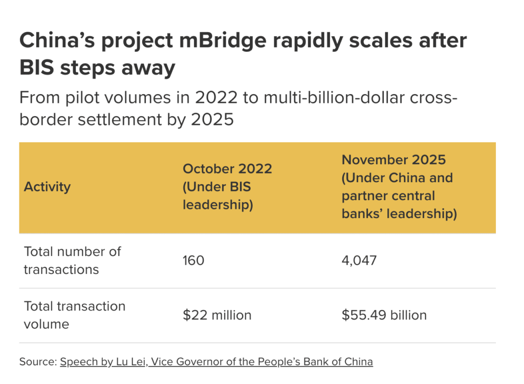 First, will renminbi‑based payment infrastructure continue to grow? In particular, will CIPS continue to expand its network in the Middle East, where yuan‑denominated trade is easier to facilitate? Project mBridge remains opaque, with limited public data available. Still, as central banks continue to develop and test wholesale CBDCs, indicators such as new country participation in cross-border projects, energy-related pilot transactions, or spikes in activity during periods of financial or geopolitical stress could point to this technology being used more actively.
