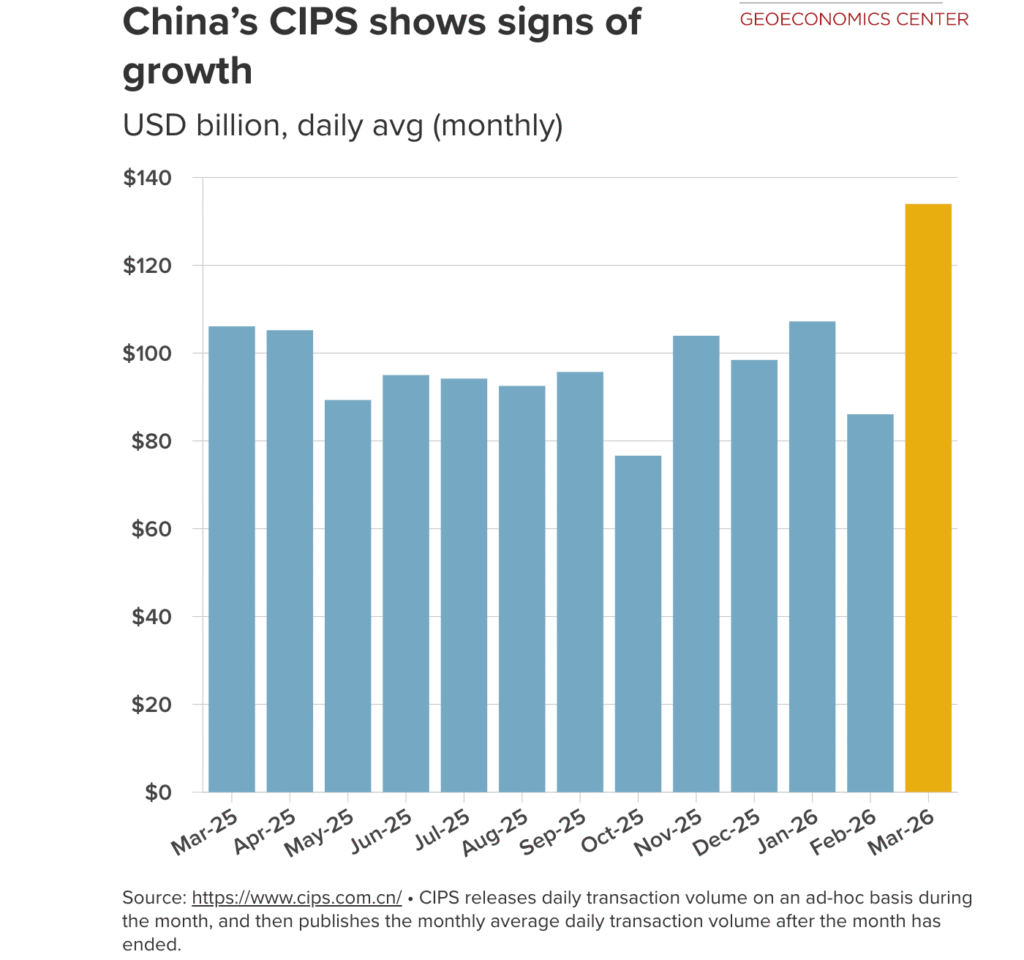 GeoEconomics Center analysis of CIPS data shows in the chart below that monthly averages for daily transaction volume remained within a $85–105 billion (600–750 billion yuan) range over the past year. In mid-to-late March, however, daily observations rose to over $130 billion (around 940 billion yuan). On April 1, CIPS reported that the daily average transaction volume in March reached $134 billion, or 920.45 billion yuan. The increase in volume is notable in the context of the ongoing Iran war, which began on February 28, but it does not by itself show that Iranian oil payments are moving through CIPS. CIPS handles tens of thousands of transactions a day that reflect a wide range of uses, so the data are best read as a sign of broader growth in renminbi settlement capacity, not as direct proof of Iran-linked flows. Beijing also has widened the mandate of CIPS so it can handle some non‑renminbi currencies and provide broader cross‑border services, making it more flexible as a backbone for regional payments.