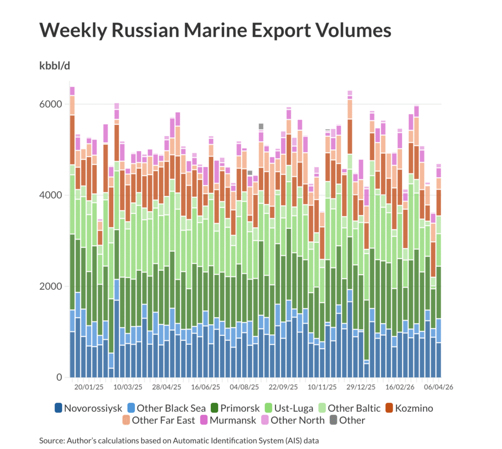 When fully operational, the terminals can get very large volumes of oil on their way to market at a high speed: on some days in 2025 and 2026, Russia’s marine terminals together shipped more than 8.5 million barrels per day. Of course, that could change if the attacks continue and lead to extended terminal shutdowns. But there are no grounds yet to believe that Russia has already been forced to reduce production or is close to doing so.
