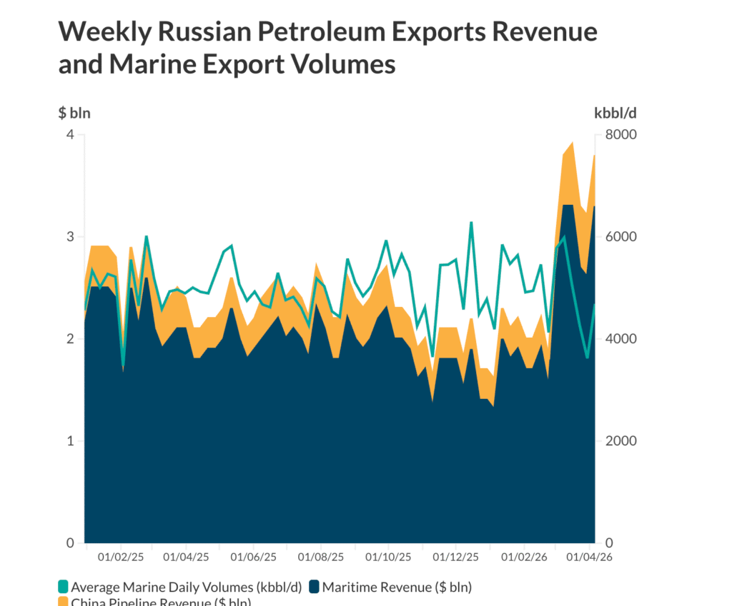 In March, for example, Russian exporters received higher, post-Iran war prices for oil that was shipped back in January 2026 or even December 2025. Similarly, the decline in shipments at the end of March will have minimal impact on real revenue until May.