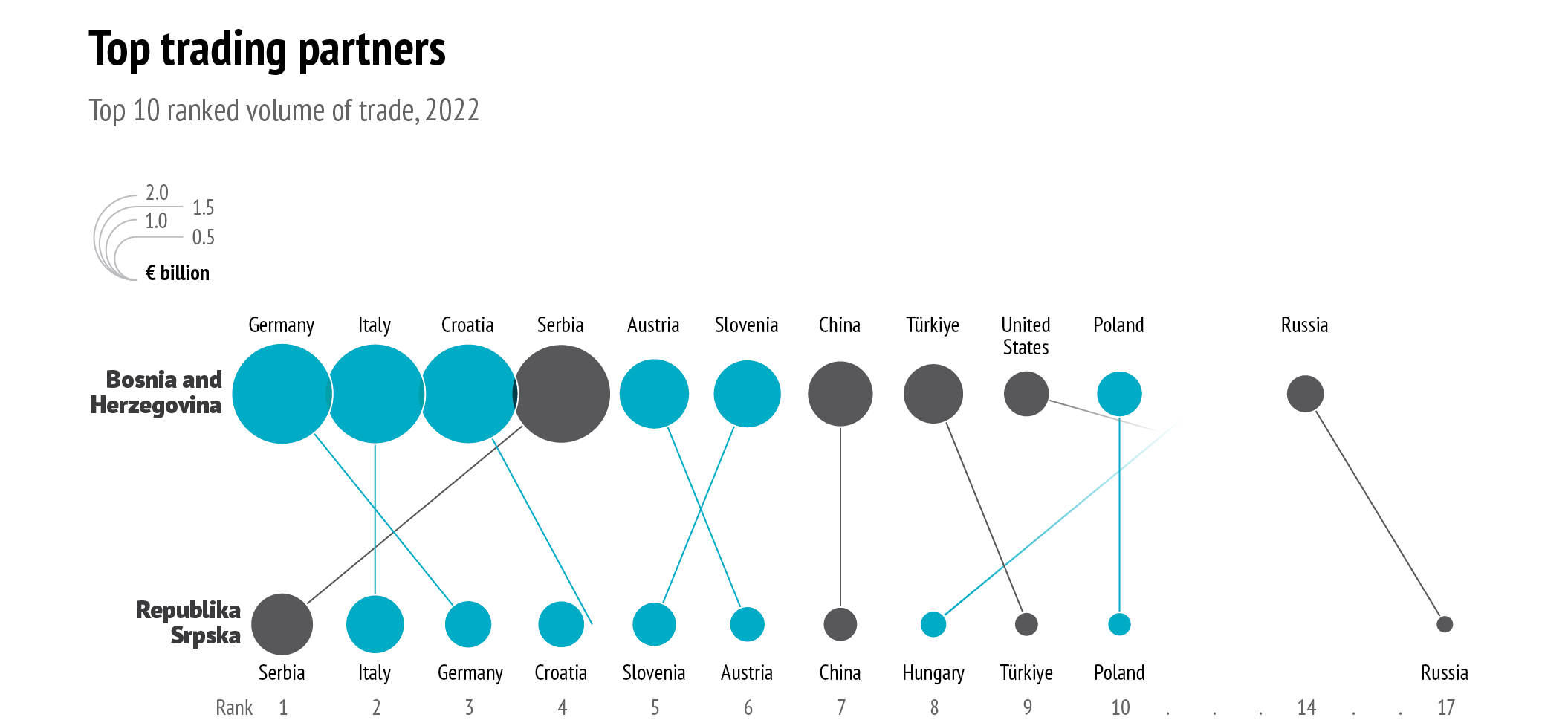 Since the start of Russia’s war of aggression against Ukraine, President Dodik has met Putin three times, more frequently than any other leader in Europe. While ideologically the two leaders seem to be on the same wavelength, economic indicators tell a different story: Russia did not even feature among the 15 top trade partners of Republika Srpska in 2022; meanwhile, EU Member States together account for more than 60 % of total trade. The same scenario can be observed at the state level, where the figure for the EU stands at 63.3 % (see diagram opposite).