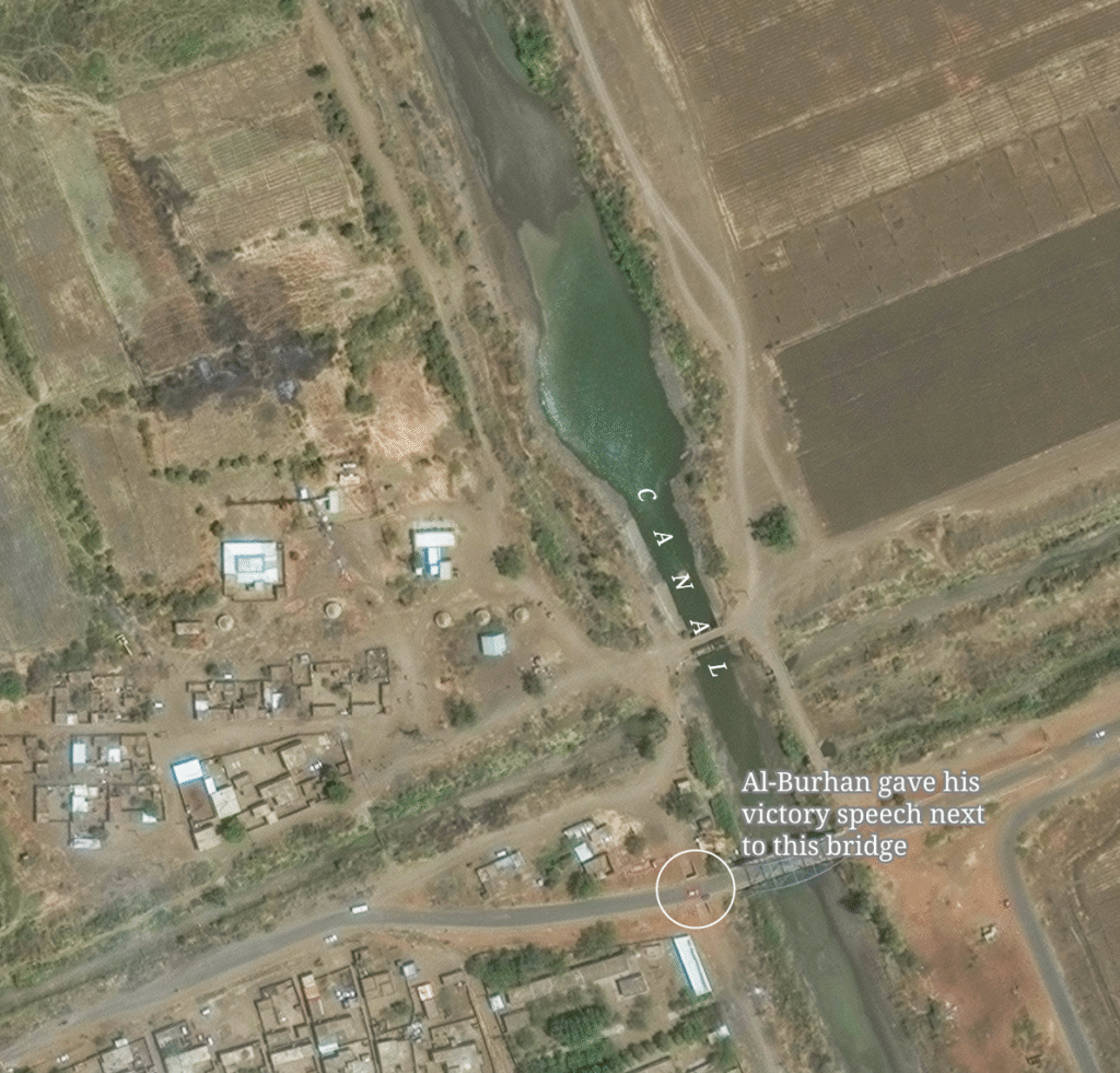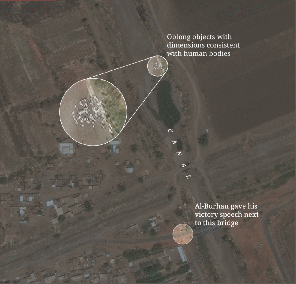 As the waters in the Gezira irrigation canals receded in the spring, more evidence emerged. Satellite images captured in May revealed what appear to be dozens of additional bodies disposed of in the canal in the Bikka area, just a few meters from the site where al-Burhan delivered his victory speech.
