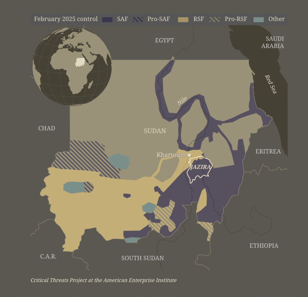 Gezira lies directly south of the capital, Khartoum, encompassing the state’s main agricultural lands—areas that have repeatedly changed hands between the warring parties throughout the conflict.