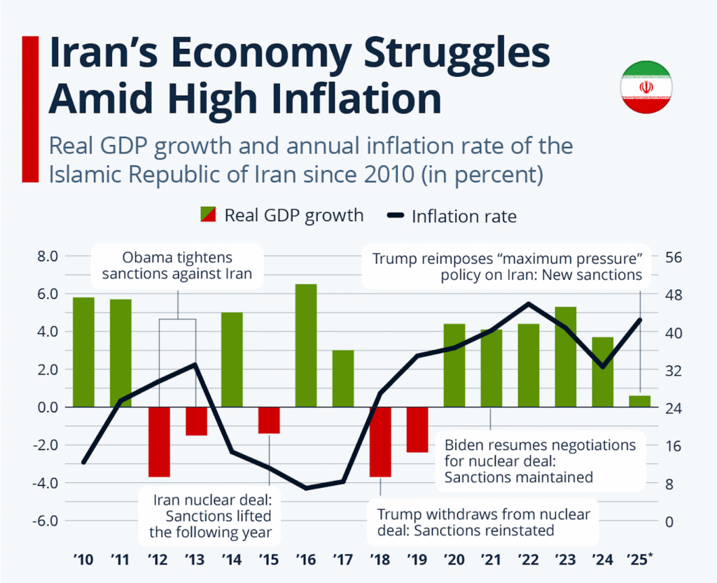 Despite possessing some of the world’s largest oil and gas reserves, Iran’s economy suffers from deep structural imbalances. Data from the International Monetary Fund indicate persistently high inflation rates, exceeding 40% in certain periods, alongside a sharp depreciation of the national currency and weak growth and investment performance.